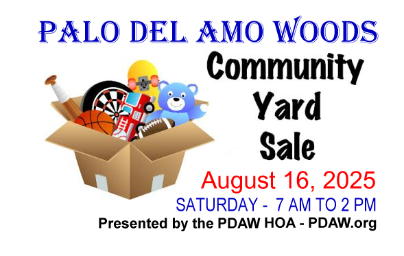 It’s almost time to get your SALE ON! Saturday, August 16th from 7 AM to 2 PM our annual PDAW Community Yard Sale is on! Every year people come from near and far to find treasures at the Palo Del Amo Woods yard sales strewn throughout the community. Come out and meet your neighbors, find those bargains and enjoy the beautiful weather!