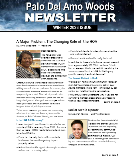 Happy February Everyone! As scheduled, our Winter 2026 PDAW Newsletter has arrived with lots of great information about how the HOA is changing, upcoming developments in and around our neighborhood, safety advisories and an update on non-conforming vehicles. Members will receive an electronic copy in their email.